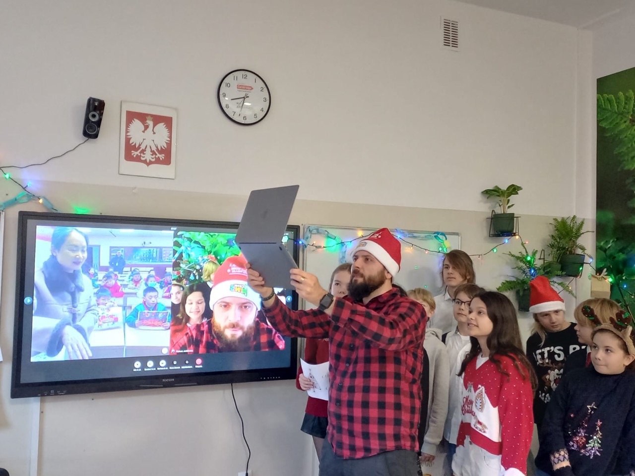 Świąteczne spotkanie online z chińskimi uczniami z Qingbaijiang Foreign Language Primary School.